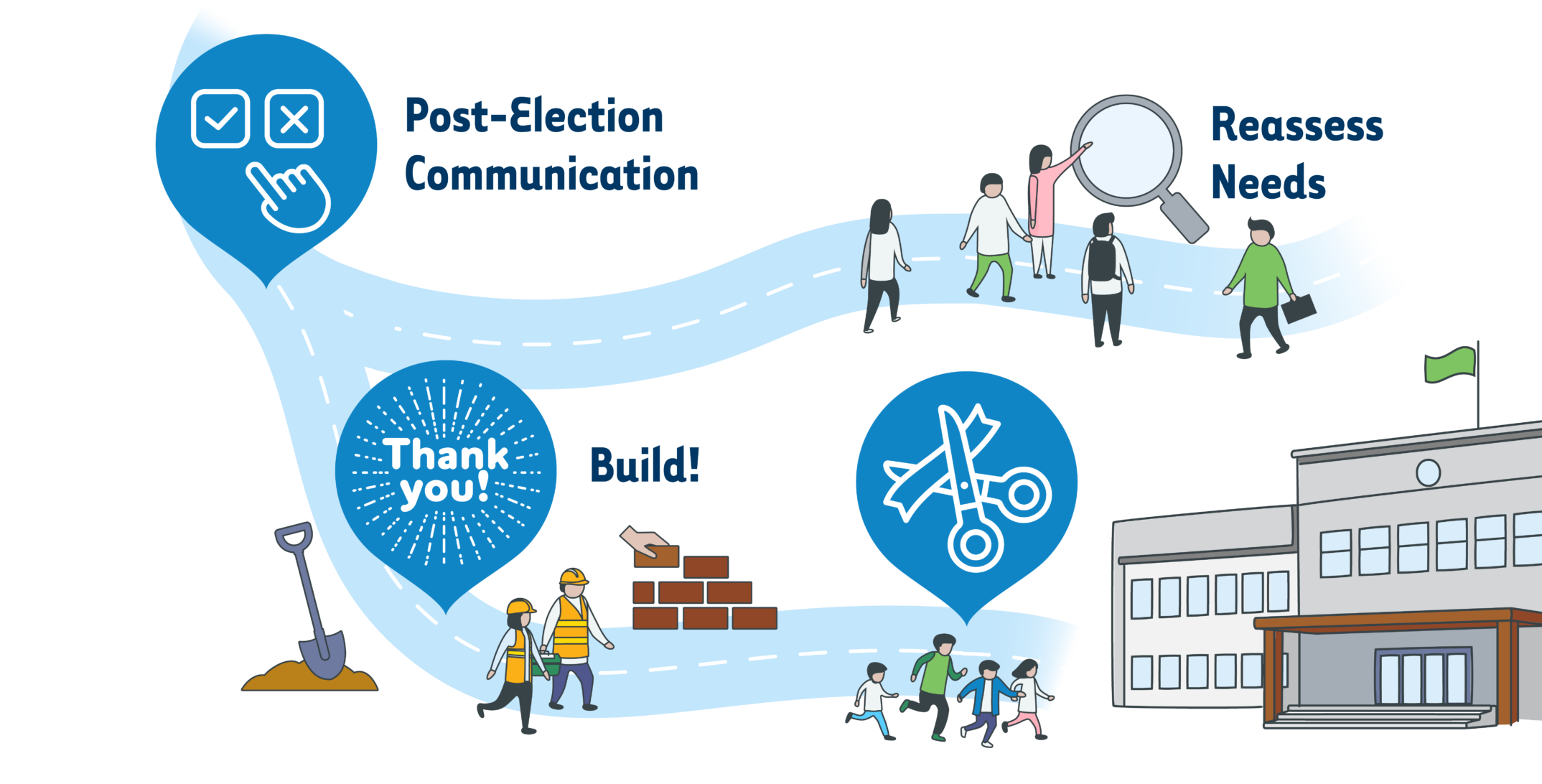 Regardless of the outcome, post-election communication is an essential part of ensuring community trust. For successful measures, districts should promptly thank voters, provide regular progress updates, and celebrate milestones such as groundbreaking and ribbon cutting. Demonstrating visible progress reinforces accountability and strengthens confidence in district leadership. For measures that do not pass, communicating lessons learned and outlining next steps can help rebuild support and inform future planning. In both cases, keeping a long-range facilities vision visible reminds the community that capital investment is an ongoing responsibility—a continuous cycle of stewardship and improvement.