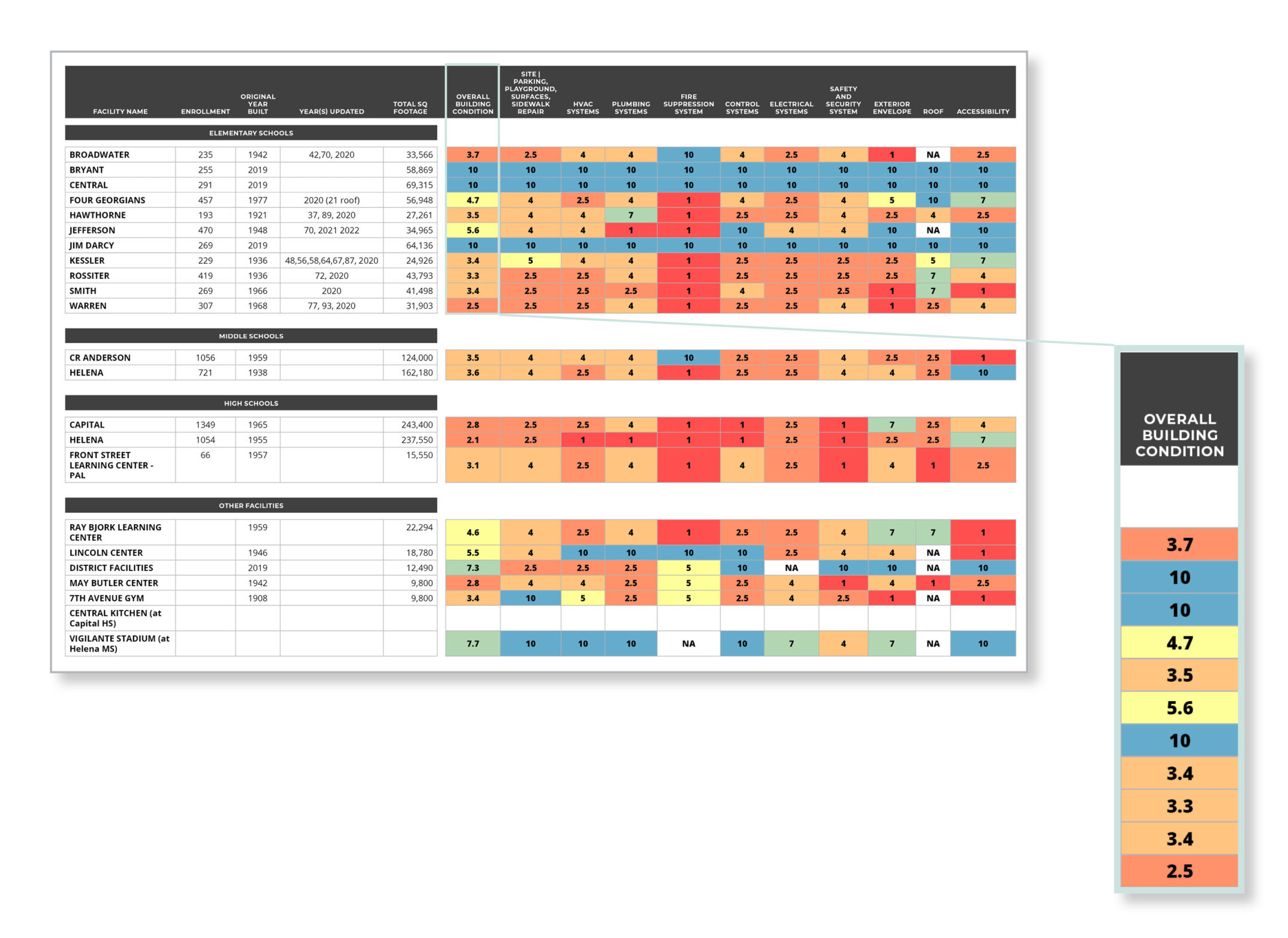 We often use graphic matrices to color-code various factors that speak to need. This includes things like building condition, number of portables, security issues, traffic circulation challenges, and educational adequacy. We would commonly color-code shades of red to indicate higher need and shades of green indicate where needs are met. These graphics call attention to problem areas very quickly, acting as a heat map for District committees determining priorities for a bond program.